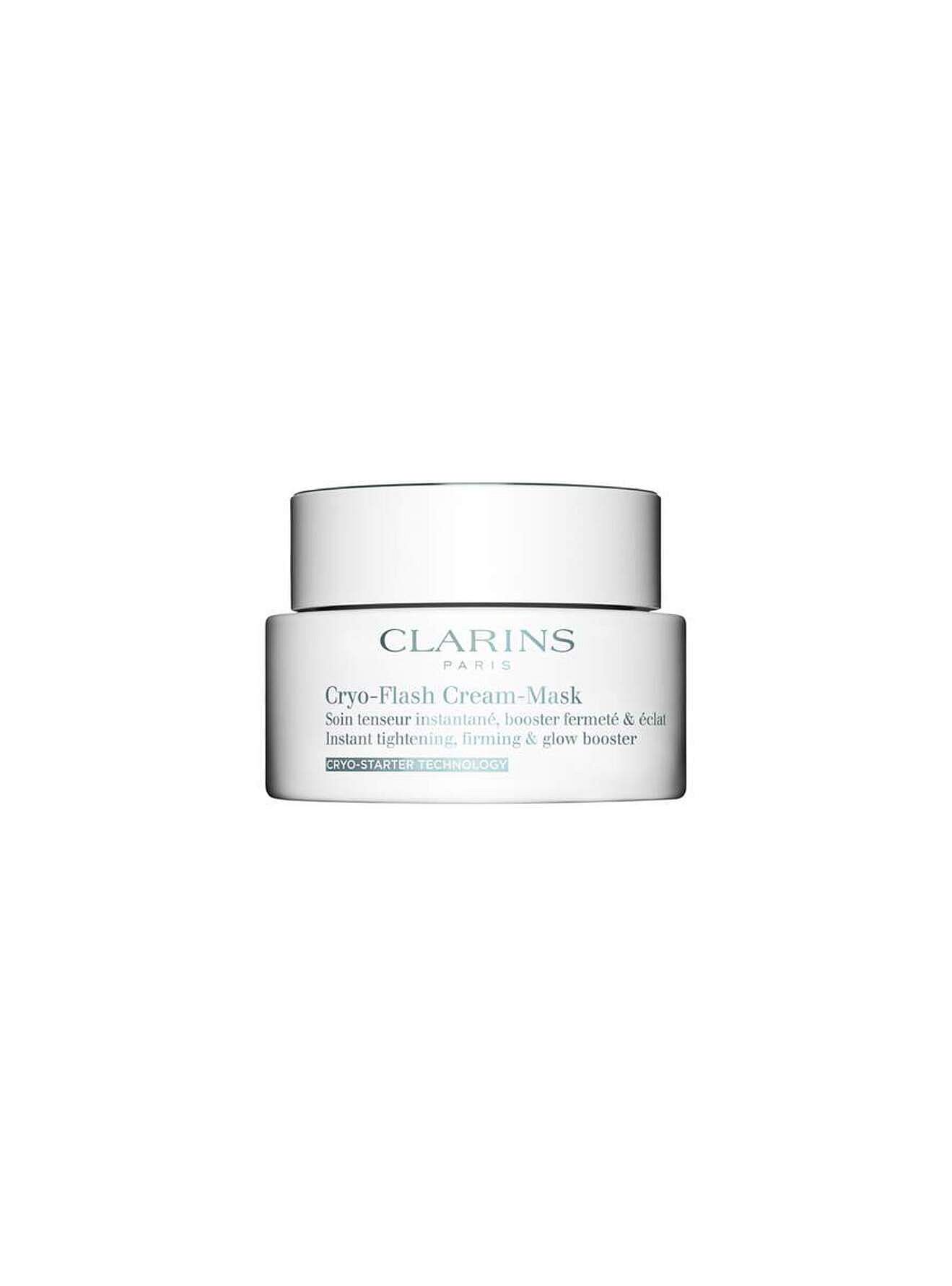 Cryo-Flash Cream-Mask er en høyt presterende, anti-age ansiktsmaske inspirert av kryoterapi (kaldbehandling) og laget med Clarins ekspertise. Du får en synlig effekt allerede etter første påføring – huden føles løftet, fast og stråler med en sunn glød. Den myke, ultrafriske og blågrønne teksturen glir som is på huden og gir en intens og umiddelbar kryoeffekt som senker hudens temperatur med -4°C*, noe som bidrar til å motvirke aldringstegn.