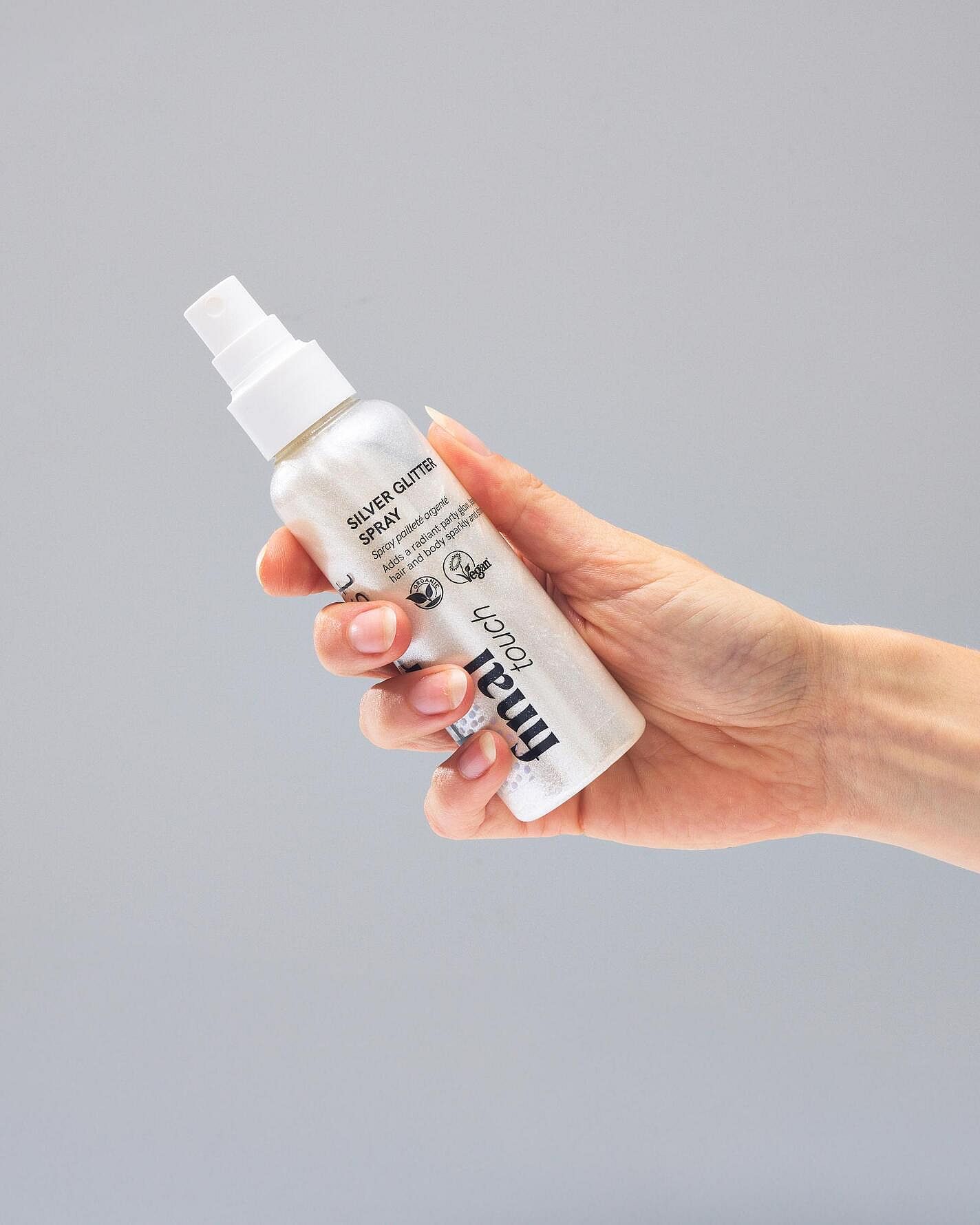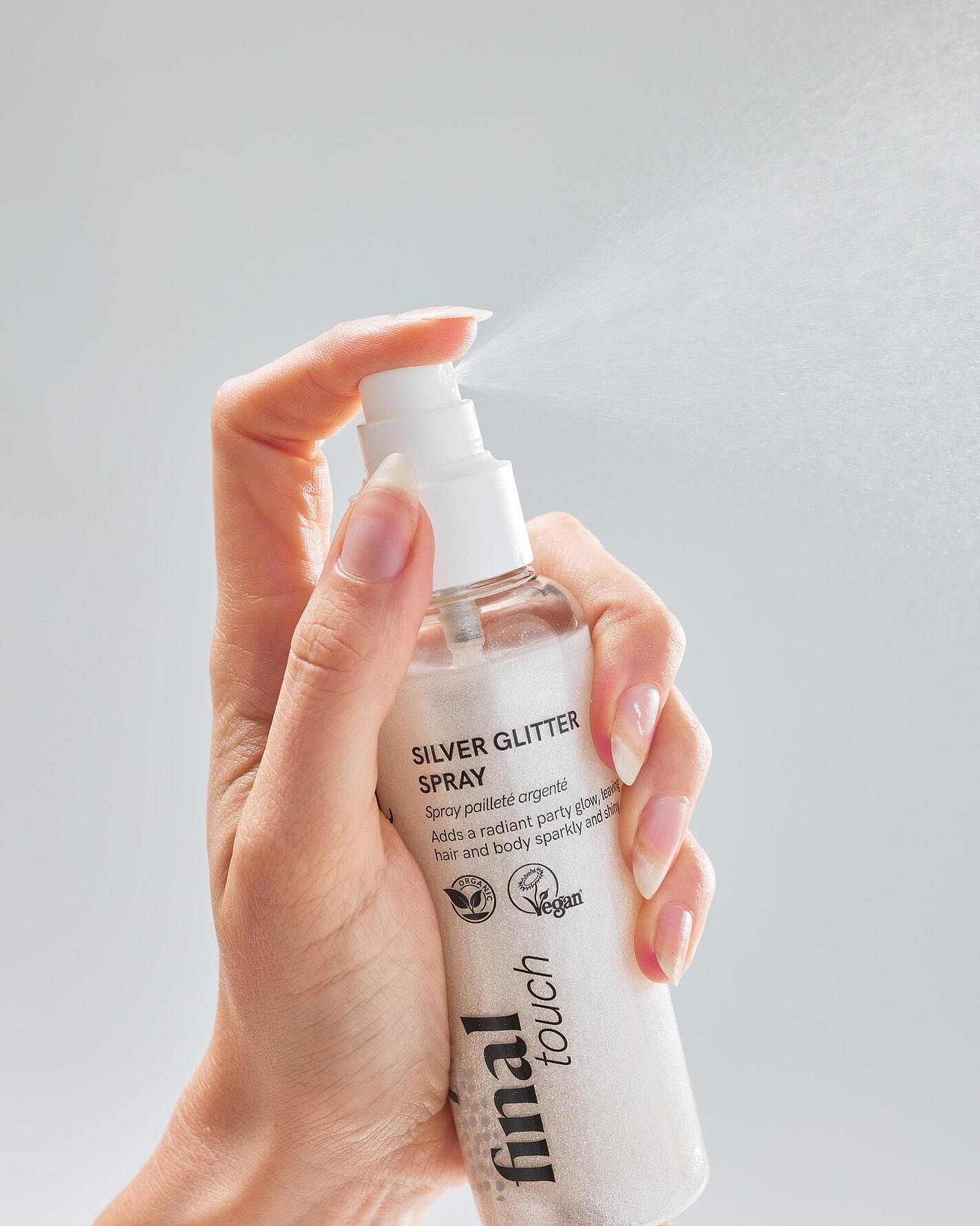 Sølvglitterspray til hår og kropp som gir en glitrende og strålende finish.