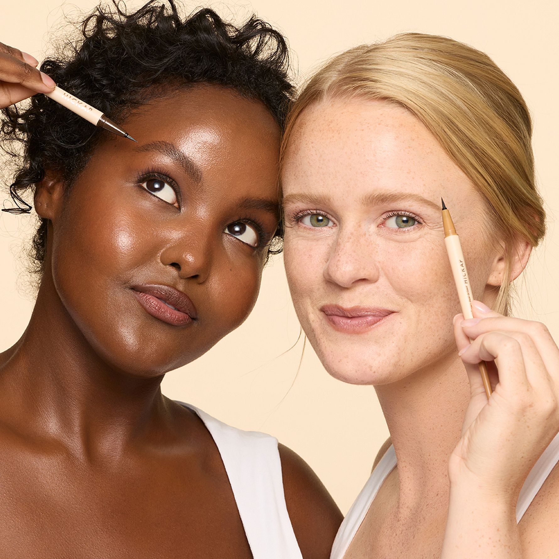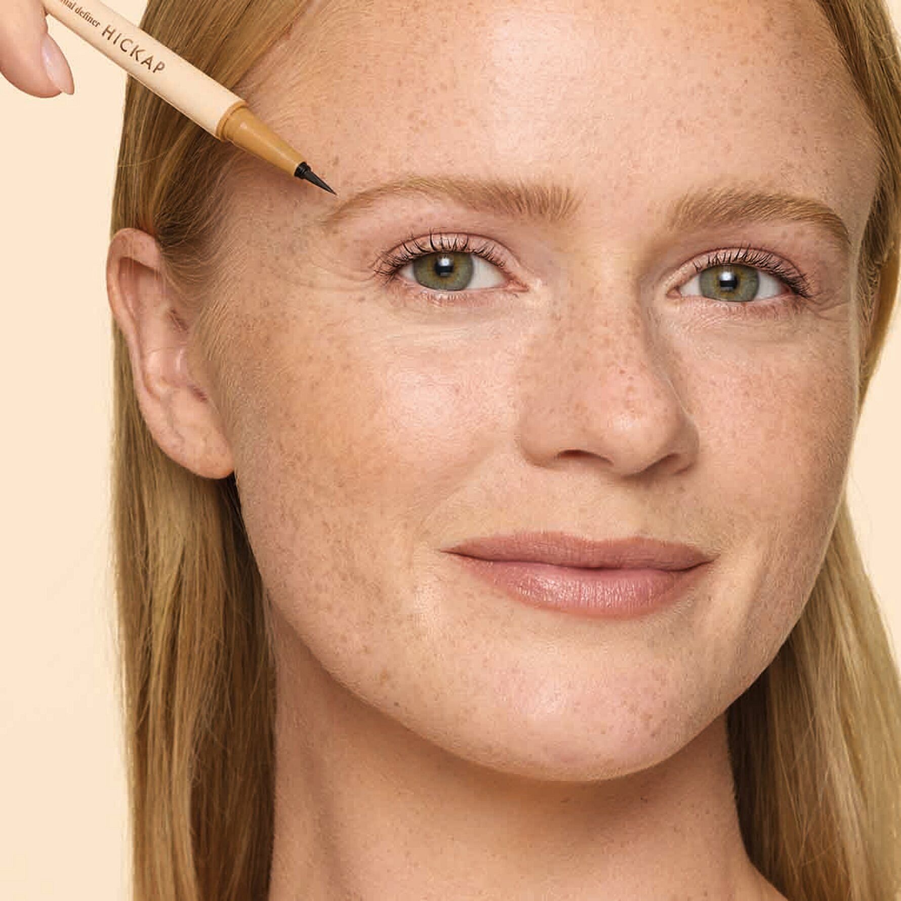 Børst brynene oppover, og bruk den kremete pennen til å fylle ut der det mangler hårstrå med korte strøk oppover i hårets retning. Med denne enden av pennen fyller du ut og definerer formen til brynene. Bruk så den andre enden av pennen til å trekke trådsmale linjer for å skape en illusjon av ekte hårstrå. Med den tynne flytende filtpennen intensiverer du resultatet og skaper tynne hårlignende linjer.