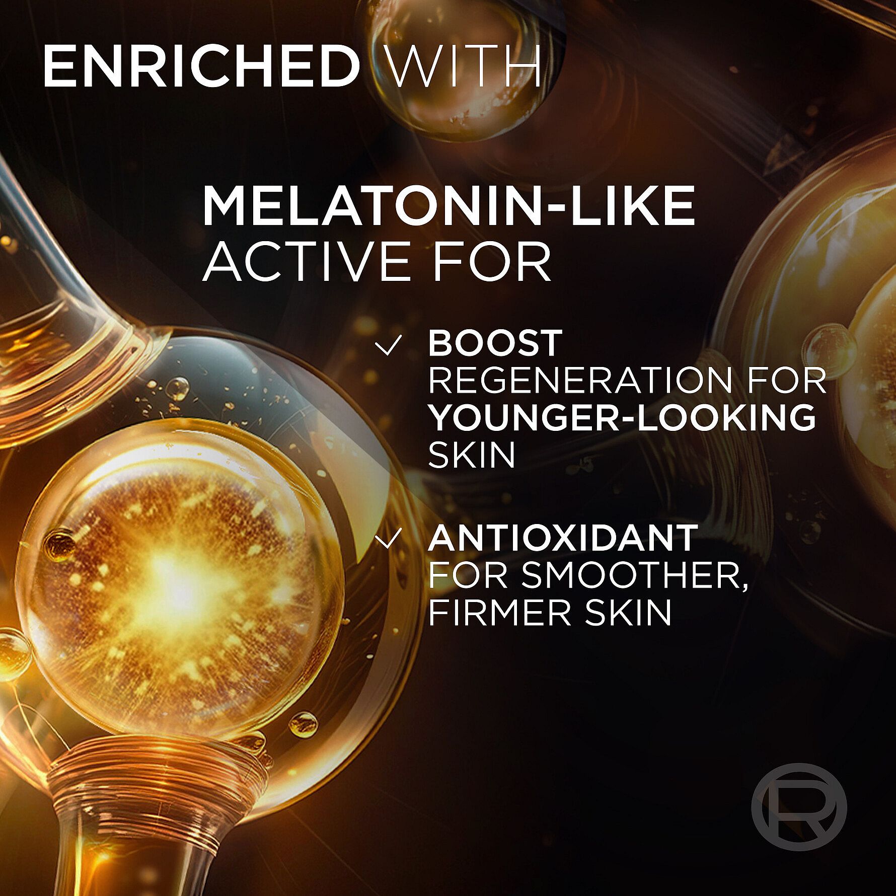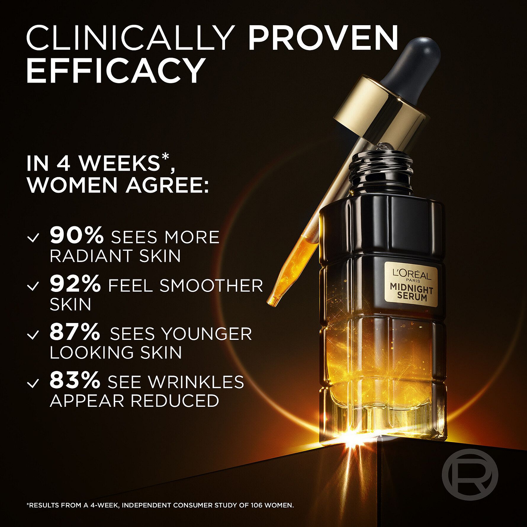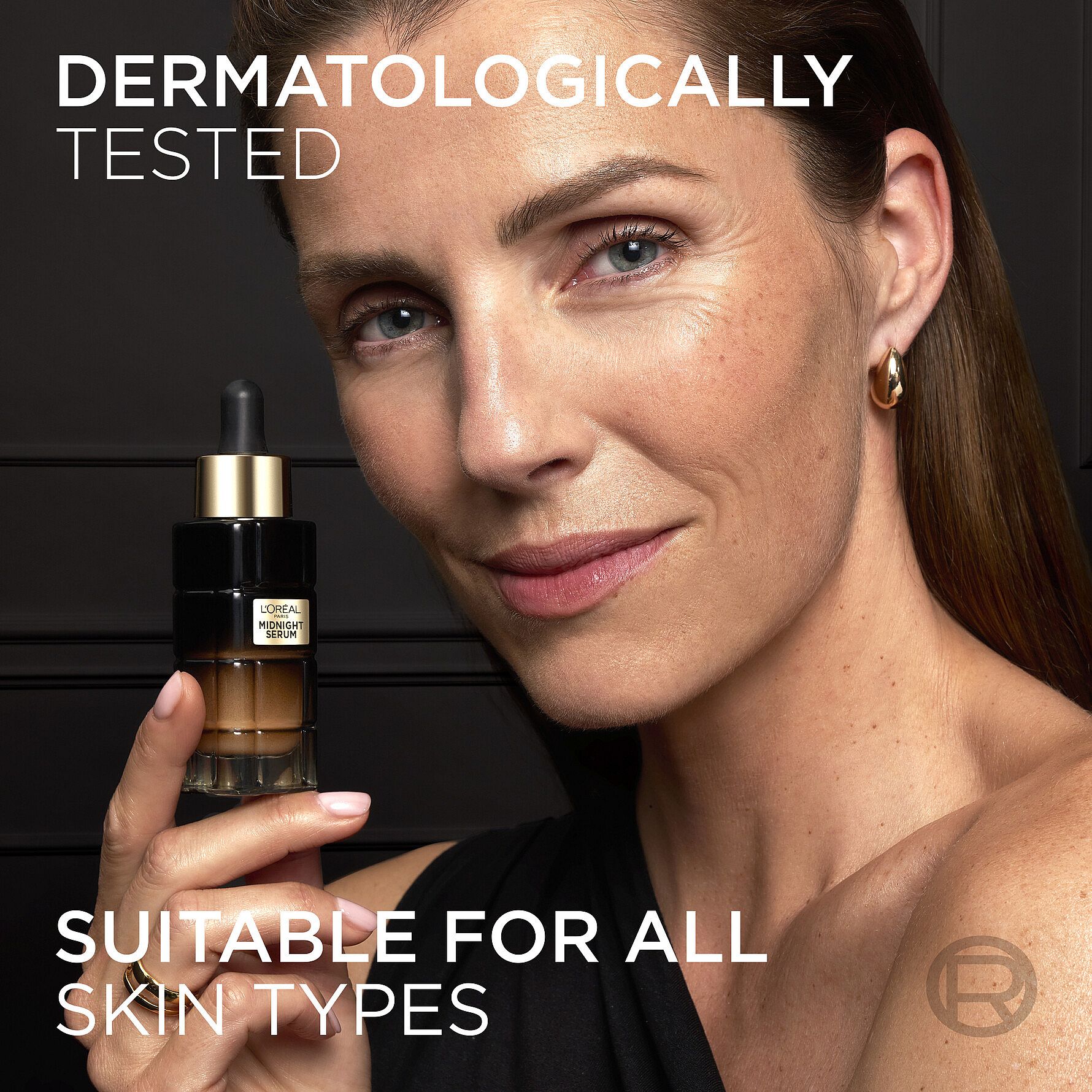 L'Oréal Paris Age Perfect Midnight Serum er et glødgivende midnattserum som inneholder en kombinasjon av 2 kraftfulle antioksidanter, neohesperidin og E-vitamin, for å beskytte cellene mot frie radikaler og intensivt revitalisere huden om natten da den er mest mottagelig for pleiende ingredienser. Midnattserumet har en behagelig og smeltende konsistens og føles ikke fet på huden. Passer til alle hudtoner og hudtyper. Resultater: umiddelbare og på lang sikt Morgenen etter: Huden føles intensivt fuktet og ser uthvilt ut som etter en god natts søvn. Etter 1 uke: Huden ser yngre, klarere og mer strålende ut. Etter 4 uker: Rynker er redusert og hudtonen er mer strålende. 84 % opplever at huden er fastere, som oppstrammet.* *Selvevaluering, 106 kvinner, 4 uker.