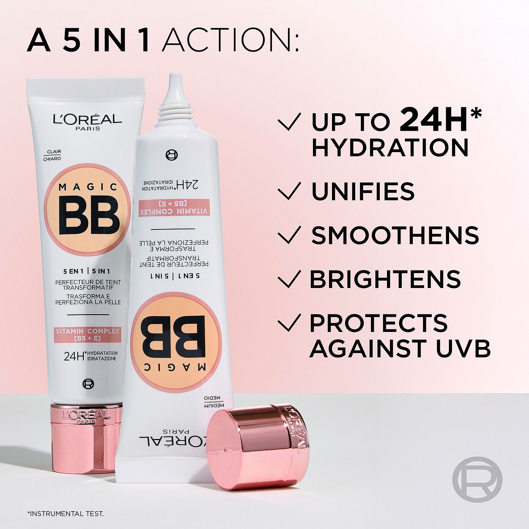 Få den perfekte nude looken med L'Oréal Paris Magic BB Cream. En pleiende og lett dekkende BB Cream. Formelen er beriket med E-vitamin + Pro-Vitamin B5 som gir huden din glød og fuktighet i 24 timer*. En lett formel som føles behagelig ved påføring, inneholder innkapslede pigmenter som endrer farge og tilpasses nettopp din hudtone. Skap den perfekte looken med en lett dekkende BB Cream for en jevn hudtone og fuktet glød!